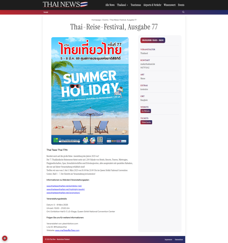 - Jedes Event bekommt eine eigene schöne Detailseite mit großem Bild, vollem Text, Preis/Ticket-Button, Veranstalter-Kontakt, Ort (mit Adresse)