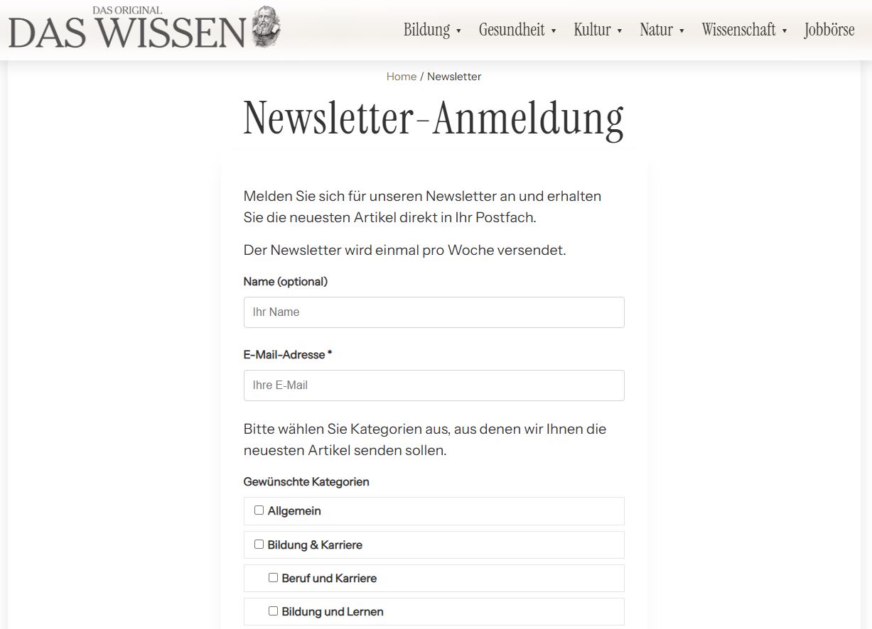 Ab sofort können sich Besucher mit einem Klick anmelden – mit Double Opt-In und optionaler Kategorie-Auswahl.