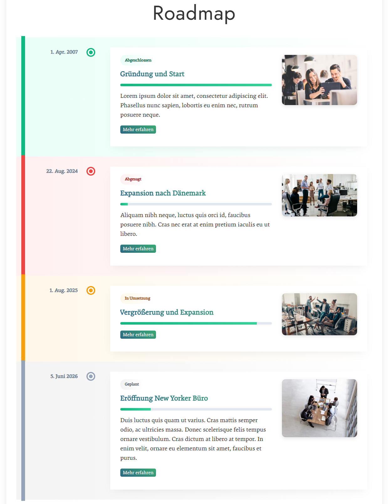 - Schöne, zeitliche Timeline mit farbigen Status-Punkten (Geplant, In Umsetzung, Abgeschlossen, Abgesagt)