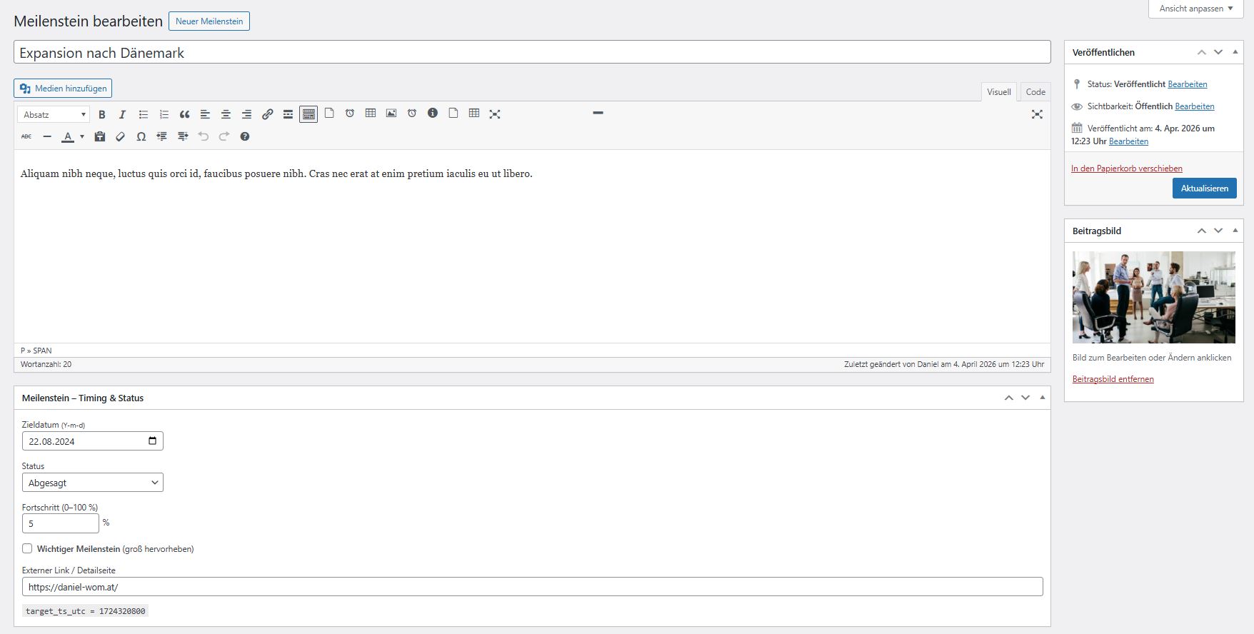 - Neue Meilensteine anlegen (Titel, Ziel-Datum, Status, Fortschritt, Bild, Link)