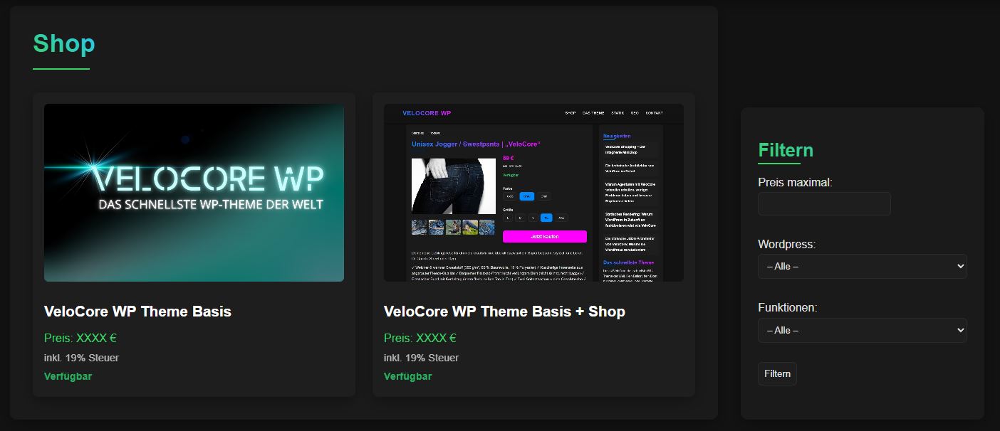 - Schöne Produkt-Übersicht mit Filter nach Preis, Kategorien und Varianten
