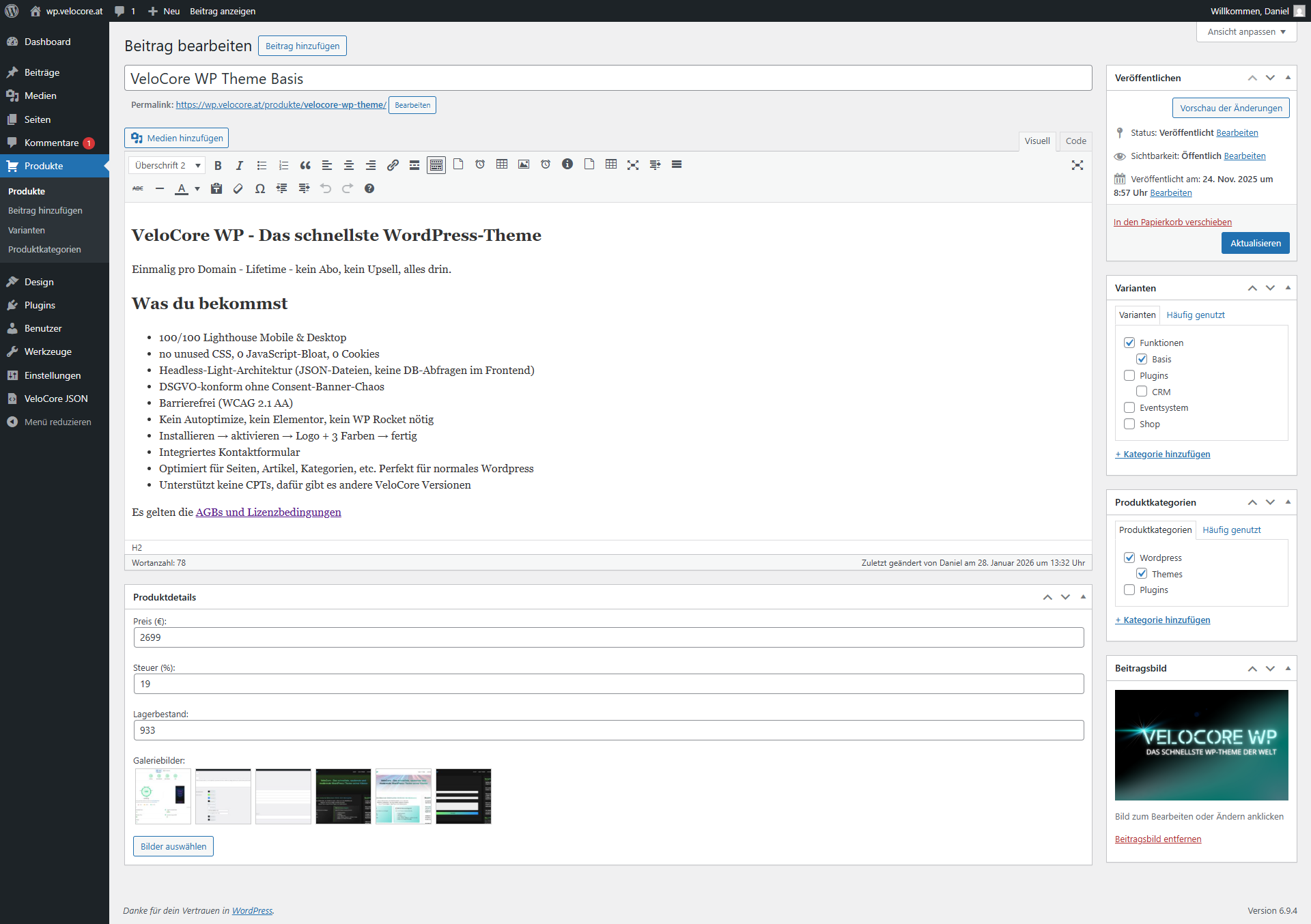 - Produkte im WordPress-Editor anlegen (Preis, Steuer, Lager, Galerie, Varianten)